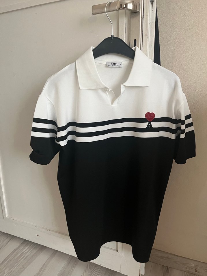 Pamuklu, yakalı, kısa kollu erkek polo tişörtü. Siyah-beyaz renk bloklu, baskılı çizgiler ve küçük kırmızı kalp detayı bulunur. Düğmeli ve günlük kullanım için uygun.