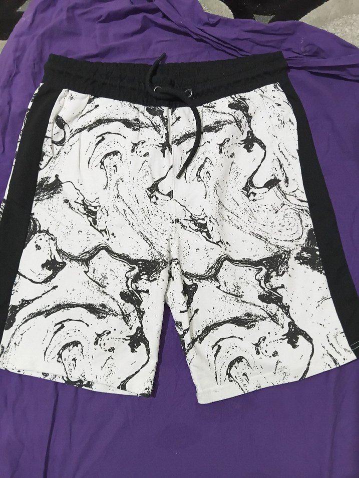 Erkekler için siyah-beyaz tie-dye desenli, bel kısmı lastikli ve bağcıklı bol kesim şort.