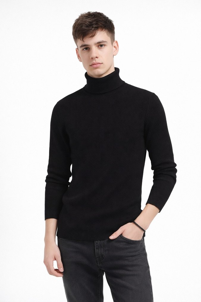 Erkek siyah yün triko, boğazlı yakalı ve uzun kollu, rahat ve şık günlük kullanım için ideal.
