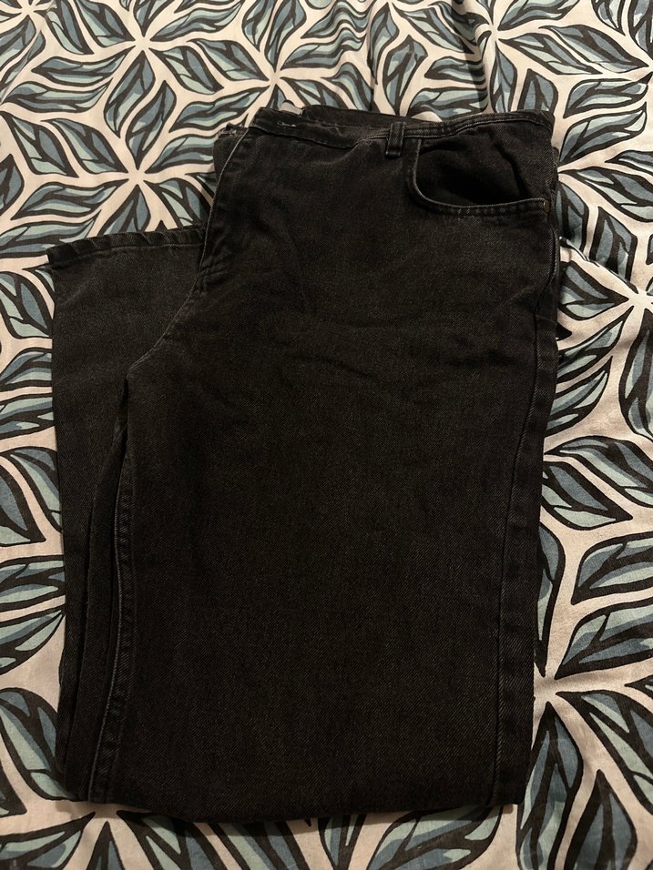 Siyah renk, bol kesim ve normal boyda kot pantolon.