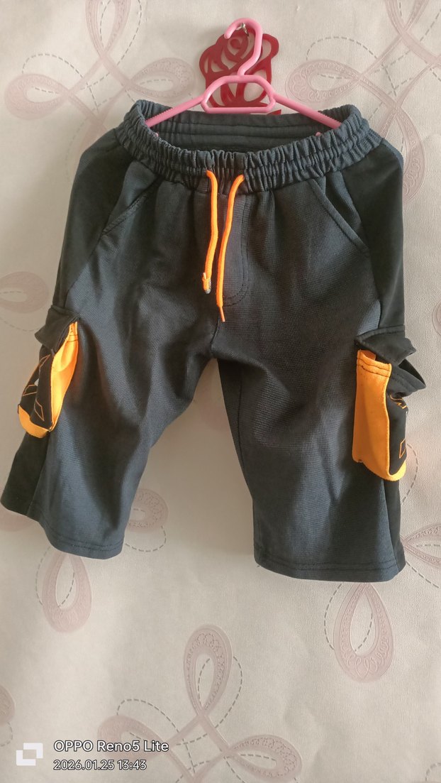 Erkekler için bol kesim siyah şort, kemerli ve yumuşak dokulu. Canlı turuncu ceplerle sokak stiline uygun.