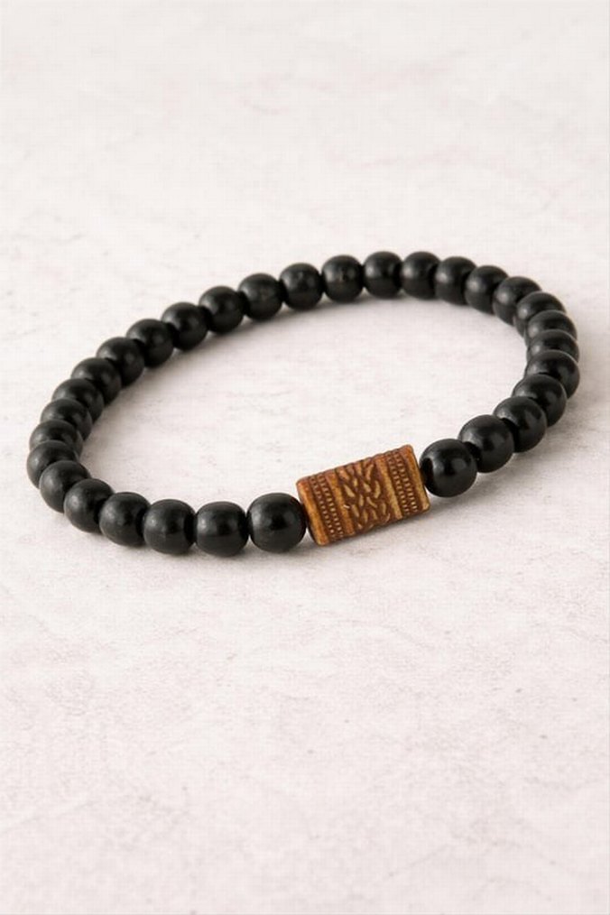 Erkek bileklik, koyu siyah boncuklar ve oyma ahşap detayla minimalist ve bohem tarzı yansıtıyor. Retro ve hippie tarzları sevenler için uygun. ✨