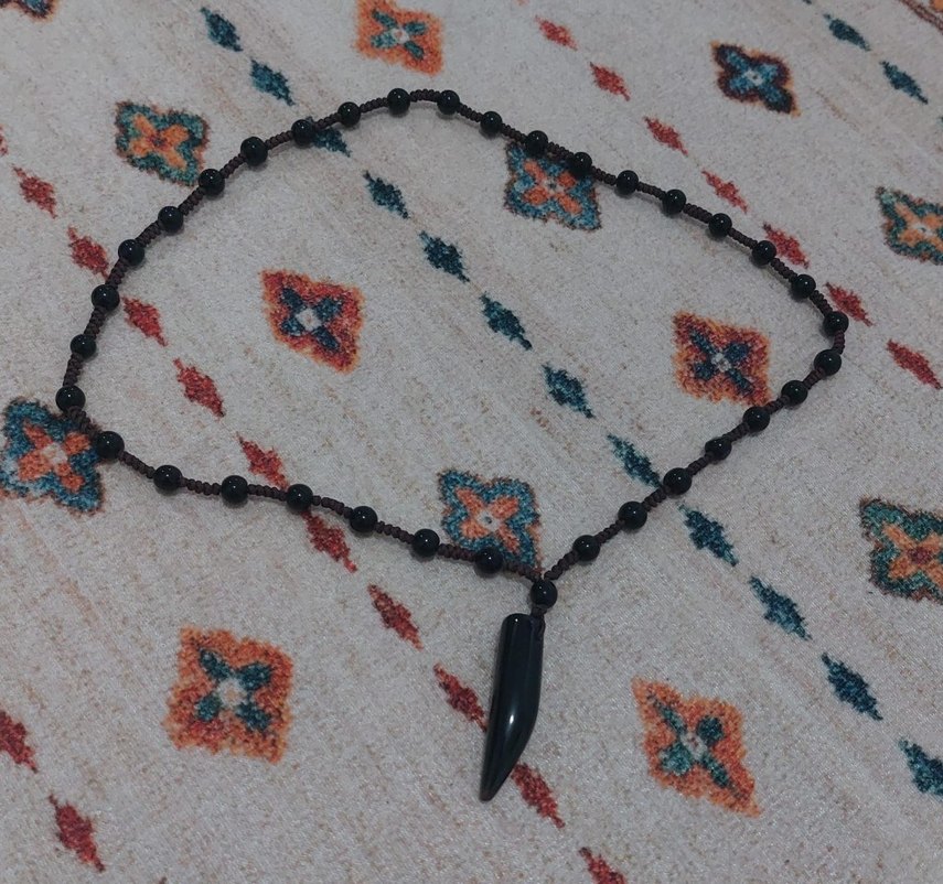Erkekler için koyu renk boncuklar ve sivri uçlu kolye ucu içeren, çok renkli detaylara sahip bohem tarzda kolye.