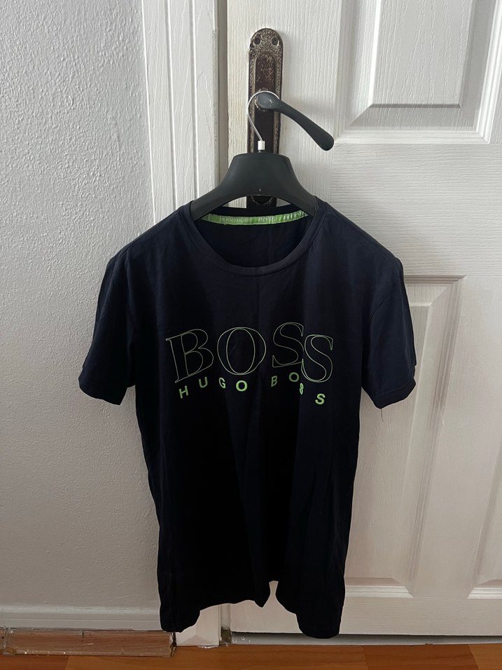 Bu siyah erkek tişörtü, fitted kesim, yuvarlak yaka ve kısa kolludur. BOSS baskılı ve kemerli detaylı, günlük kullanıma uygun trendy bir tasarımdır.