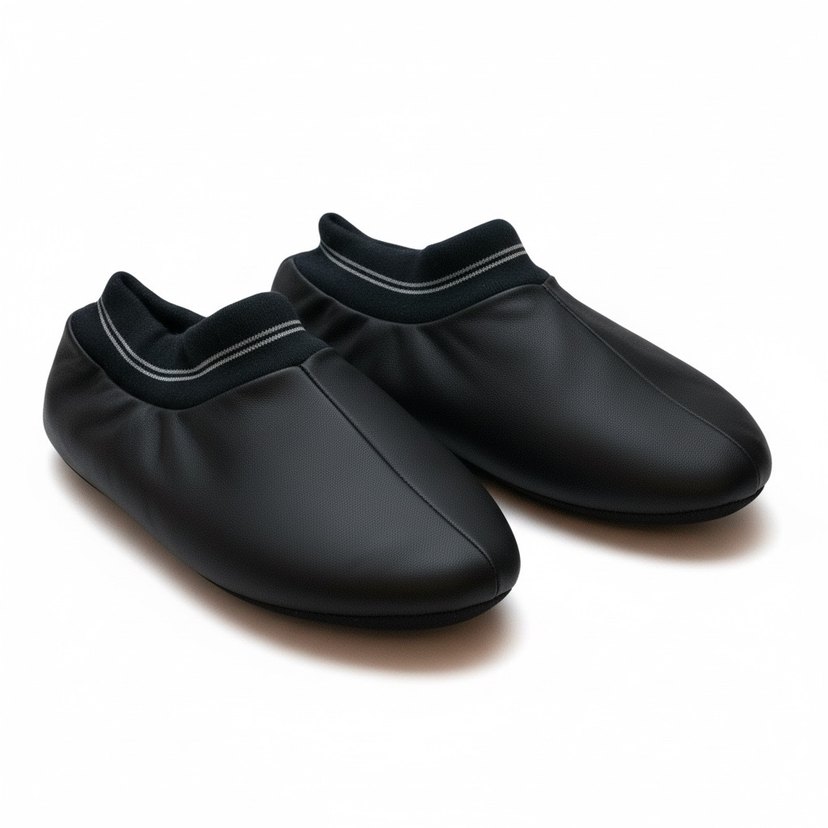 Erkekler için siyah, çağdaş tarzda, desen içermeyen ve rahat bir yapıya sahip ev terlikleri. Spor şıklığını yansıtan kolay kullanımlı tasarım.