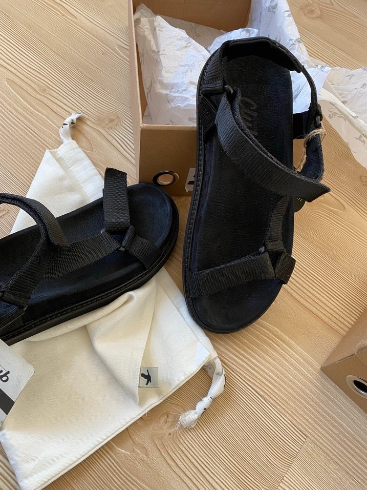 Erkekler için siyah renkte, tabanlı, deri malzemeden yapılmış, cırt cırtlı bantlara sahip minimalist sokak stili sandaletler.