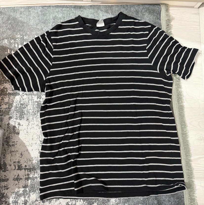 Siyah renkte, kısa kollu, yuvarlak yaka ve rahat kesime sahip çizgili erkek tişörtü, sentetik kumaştan üretilmiştir.