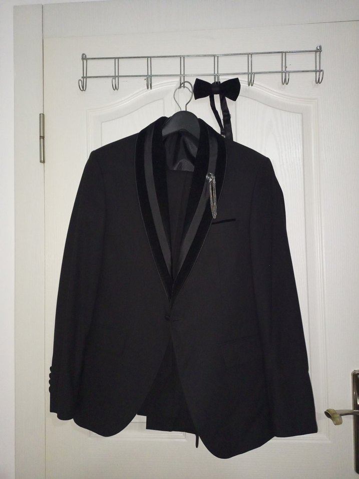 Siyah erkek takım elbisesi. Notch yaka ve askılı kollara sahip, klasik şıklık ve gotik tarzı bir arada sunar. Siyah pantolon, yelek, papyon, yaka zinciri ile birlikte.