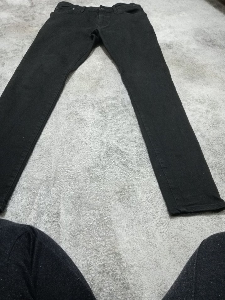 Erkekler için siyah, dar kesim, normal boy, kot pantolon. Desensiz ve günlük kullanıma uygun.