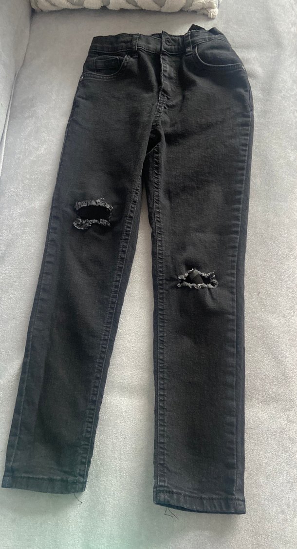Erkekler için siyah dar kesim kot pantolon, tokalı detaylara sahip ve sokak modası tarzında. Dizlerde hafif yırtıklar bulunur.
