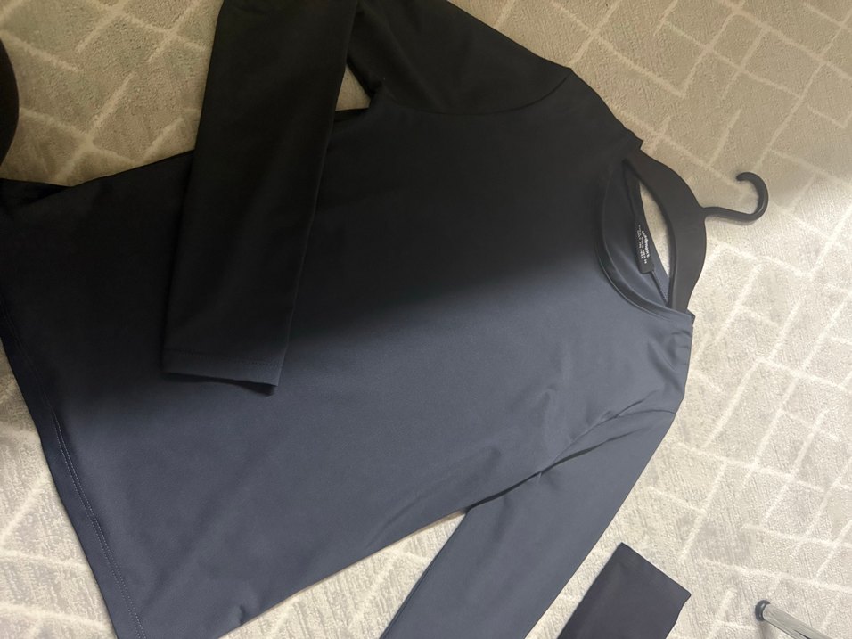 Siyah renkte, dar kesim ve uzun kollu erkek atlet, normal boyda ve desensiz tasarıma sahiptir. Athleisure tarzına uygundur.