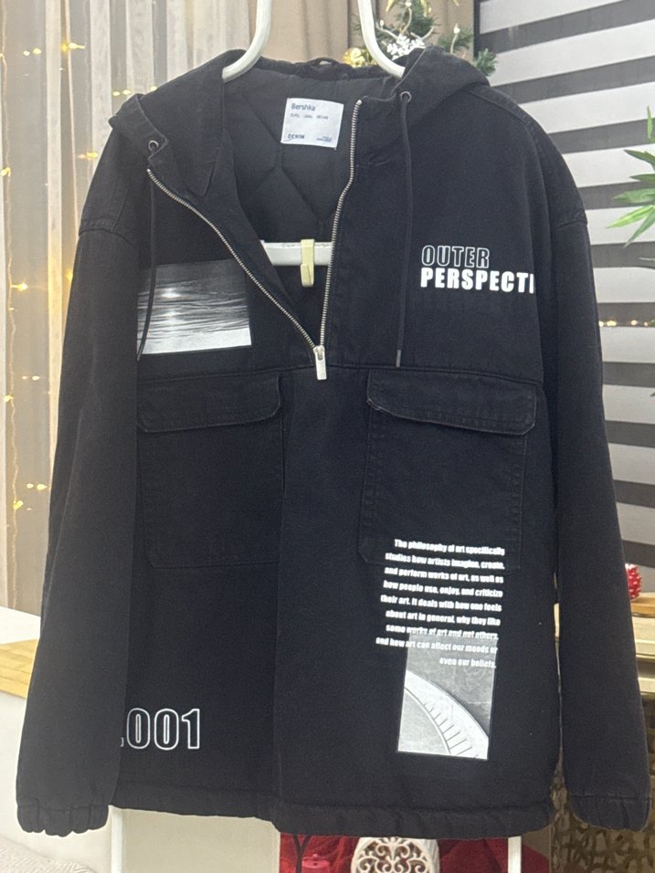 Bu siyah denim erkek ceket, regular fit ve fermuarlı ön kısmıyla dikkat çeker. Notched lapel yakalı ve baskılı detaylara sahiptir. Sokak modası için uygundur.