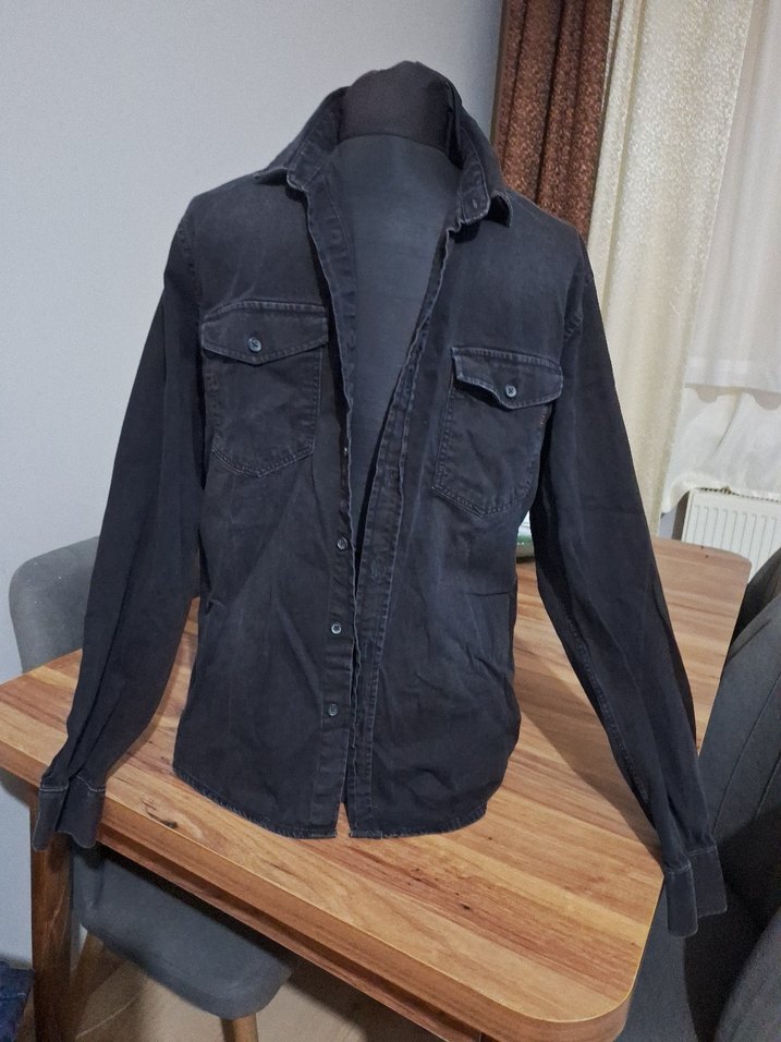 Erkekler için siyah denim gömlek, kesik yakalı ve düğmeli. Uzun kollu, normal kesim ve günlük kullanım için uygundur.