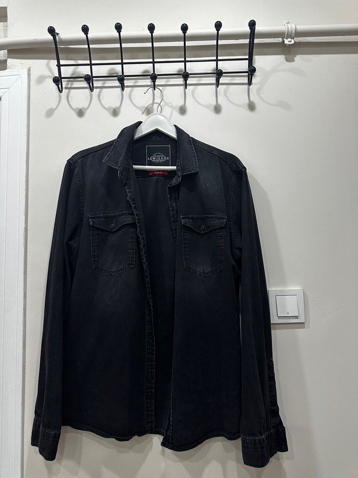 Erkekler için siyah denim gömlek, bol kesim, uzun kollu ve yaka kısmı kesikli. Düğmeli ön ve iki göğüs cebi bulunur. Günlük kullanıma uygun rahat sokak stili gömlek.