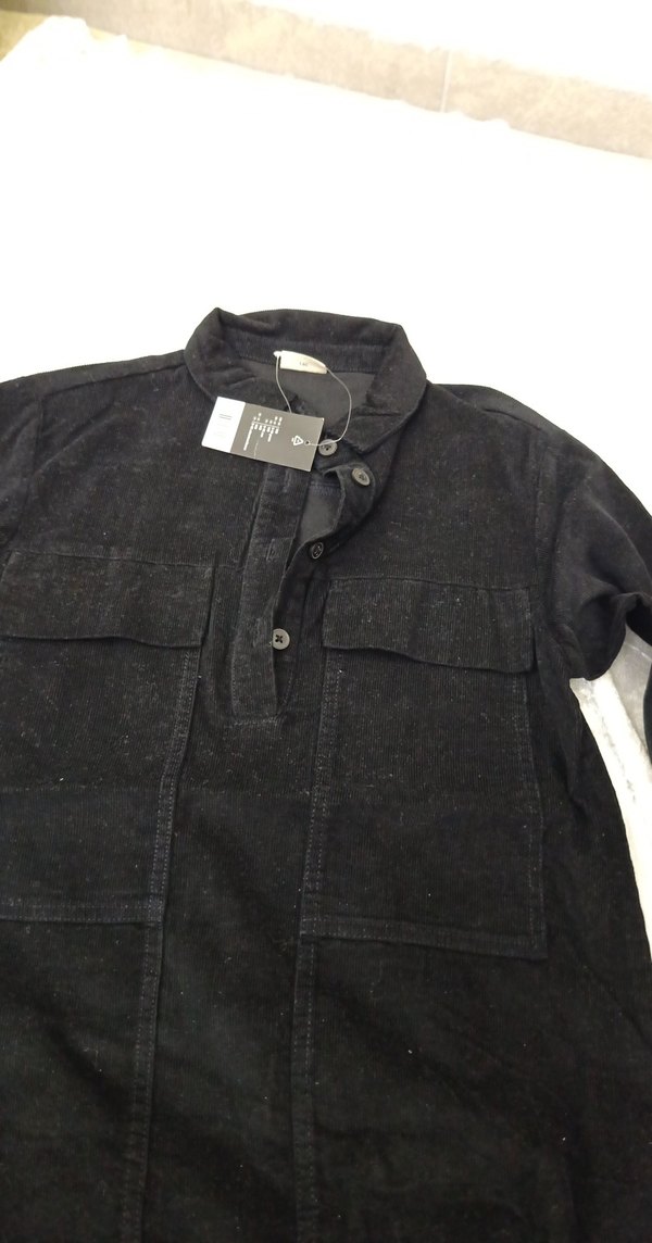 Erkek siyah denim gömlek, uzun kollu ve yakalıdır. Düğmeli ve iki ön cepli, rahat kesimiyle günlük kullanıma uygundur.