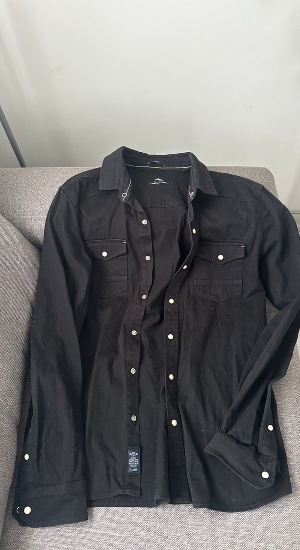 Erkekler için siyah denim gömlek, yakalı ve düğmeli. Uzun kollu, bol kesim ve iki göğüs cebi bulunur, günlük rahat kullanım için uygundur.
