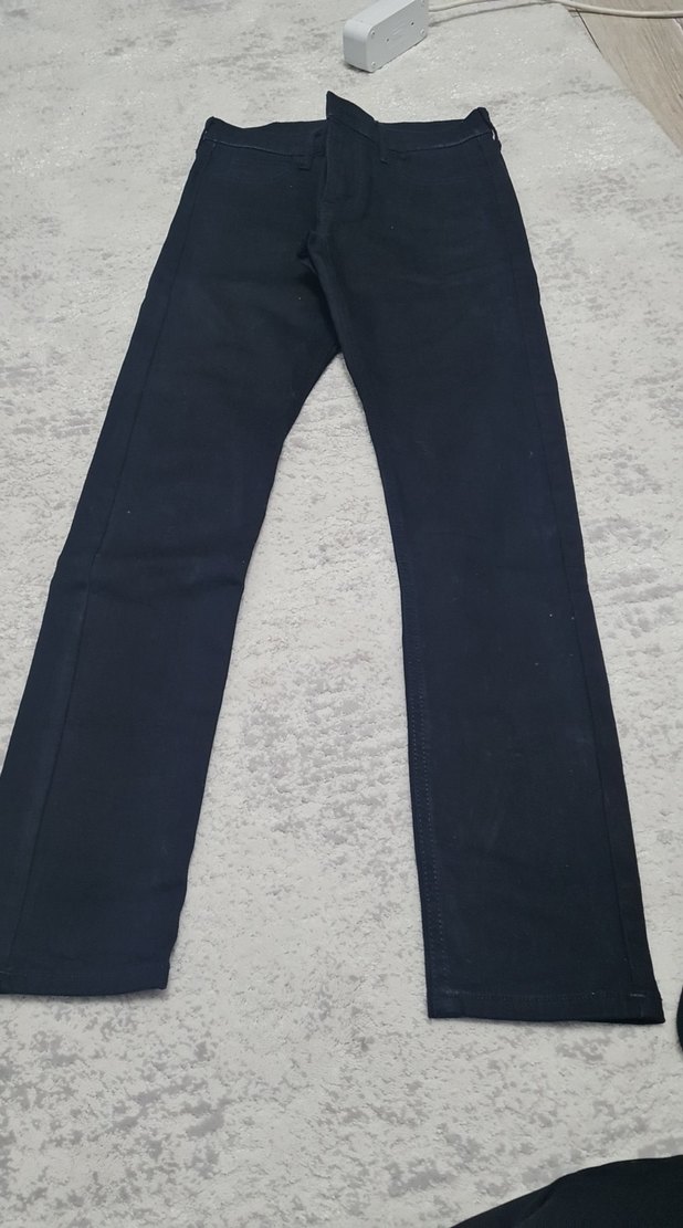 Erkekler için siyah renkte, denim kumaştan yapılmış, regular fit kesime sahip rahat ve şık pantolon. cok yeni