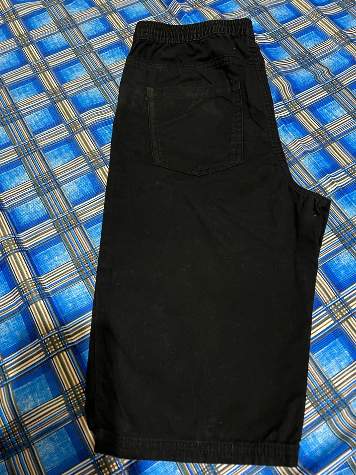 Siyah denimden yapılmış, regular fit ve düğmeli detaylara sahip, rahat sokak stili erkek şortu.