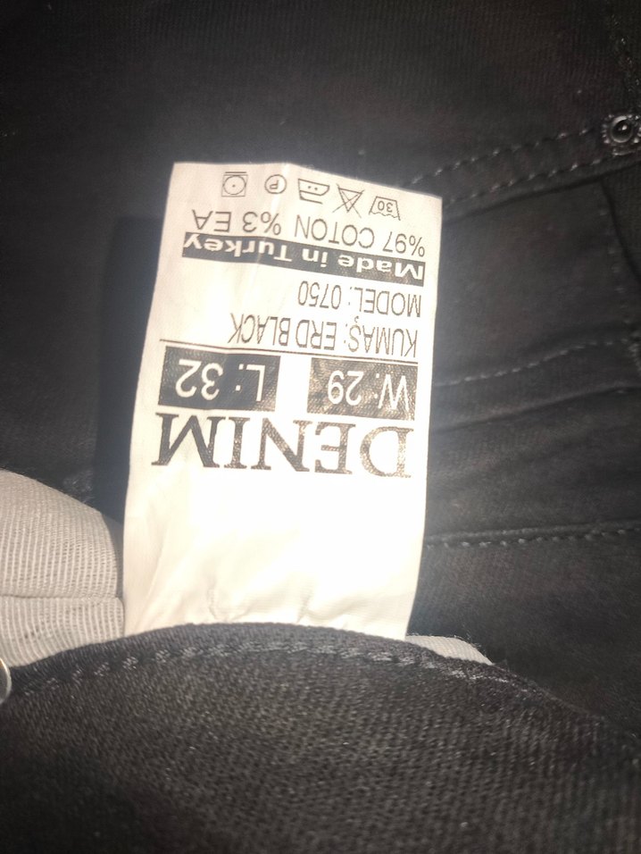 Siyah denim erkek rozeti, W-29 ve L-32 beden etiketiyle. %97 pamuk, %3 EA kumaş, Türkiye'de üretilmiştir. ️