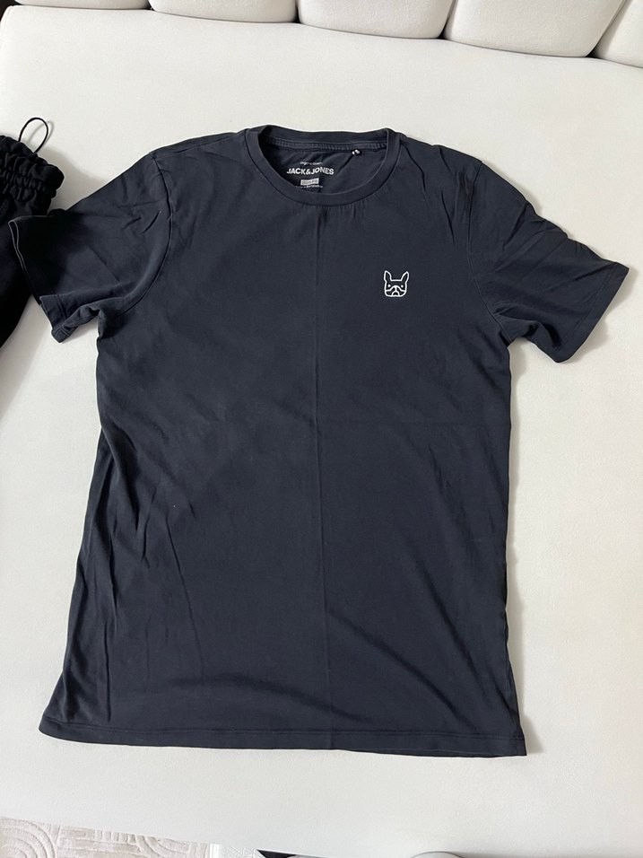 Erkek tişörtü, bol kesim, kısa kollu ve yuvarlak yakalıdır. Siyah denim kumaştan yapılmıştır ve günlük kullanıma uygundur.