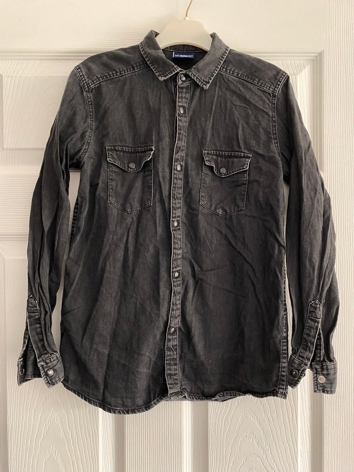 Erkek siyah denim gömlek, uzun kollu ve düğmeli. Salaş kesim, yakası notched lapel ve iki ön cep bulunur, günlük sokak stili için uygundur. 9-10 yaş