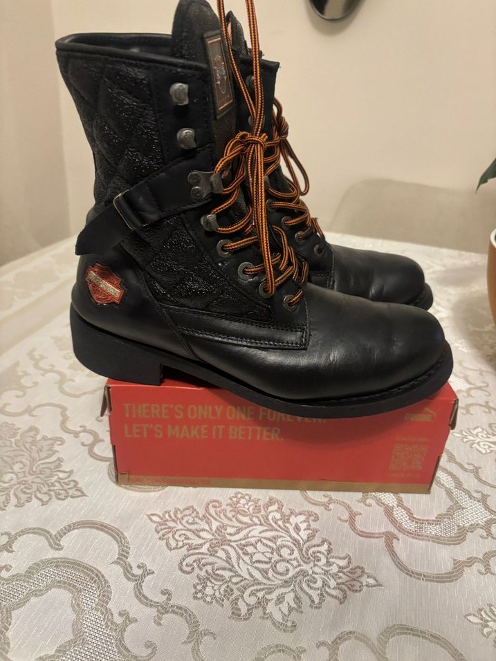 Siyah deri, desenli biker botlar, tokalı kayışlarla ve bağcıklı. Yüksek topuklu tasarım üzerinde "LET'S MAKEIT BETTER, HERE'SONLYONE" yazısı bulunur.