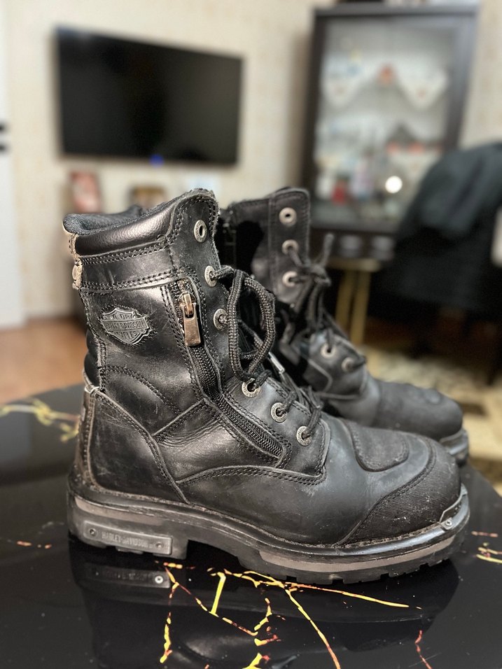 Siyah deri biker botlar, yüksek topuklu ve tokalı, koyu kamuflaj desenli. Rock punk tarzı için uygun. Bir ay bile giyilmemiştir. Temizdir