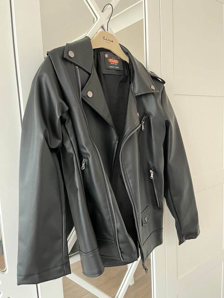 Siyah deri biker ceket, çıtçıtlı yaka ve fermuarlı detaylara sahiptir. Regular fit, askılı kollu ve normal boydadır, günlük kullanım için uygundur. Hiç giyilmemiştir s beden