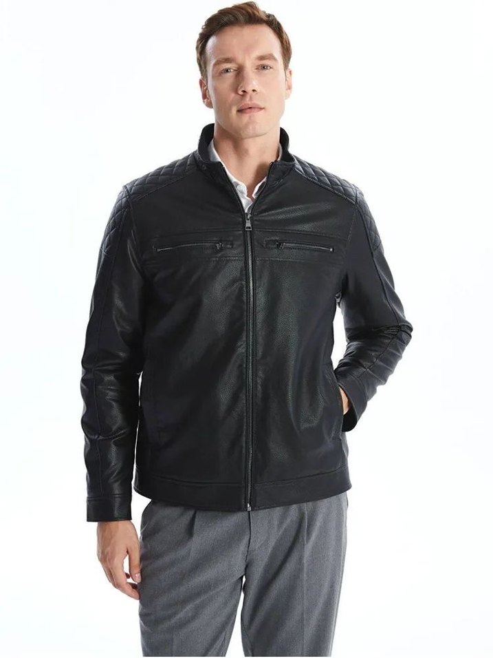 Siyah deri biker ceket, uzun kollu ve kesik yaka. Günlük kullanım için uygun, regular fit ve kemerli detaylı.