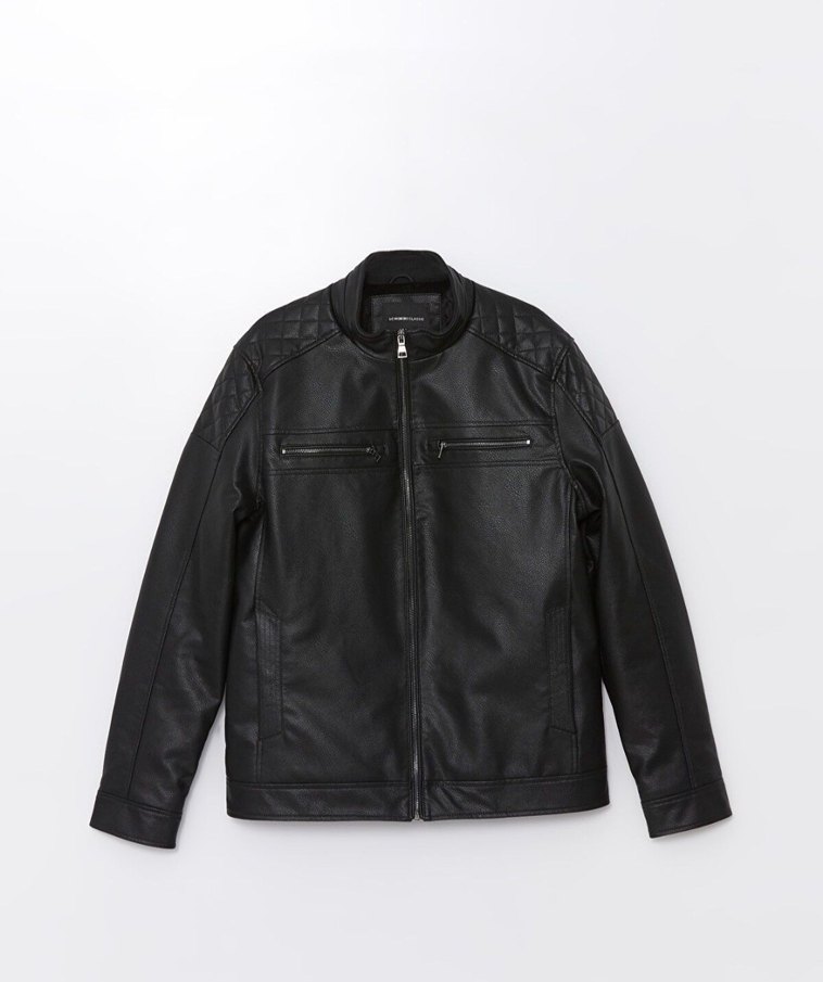 Erkekler için siyah, fitted kesim deri biker ceket, kesik yaka ve fermuarlı ceplerle trend casual tarz sunar.