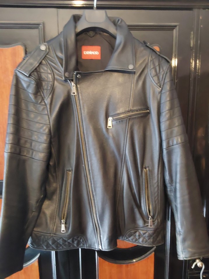Siyah deri biker ceket, kesik yaka, fermuarlı cepler ve kemerli bel ile. Düzenli kesim ve askılı kollara sahip, günlük sokak stili için uygun.