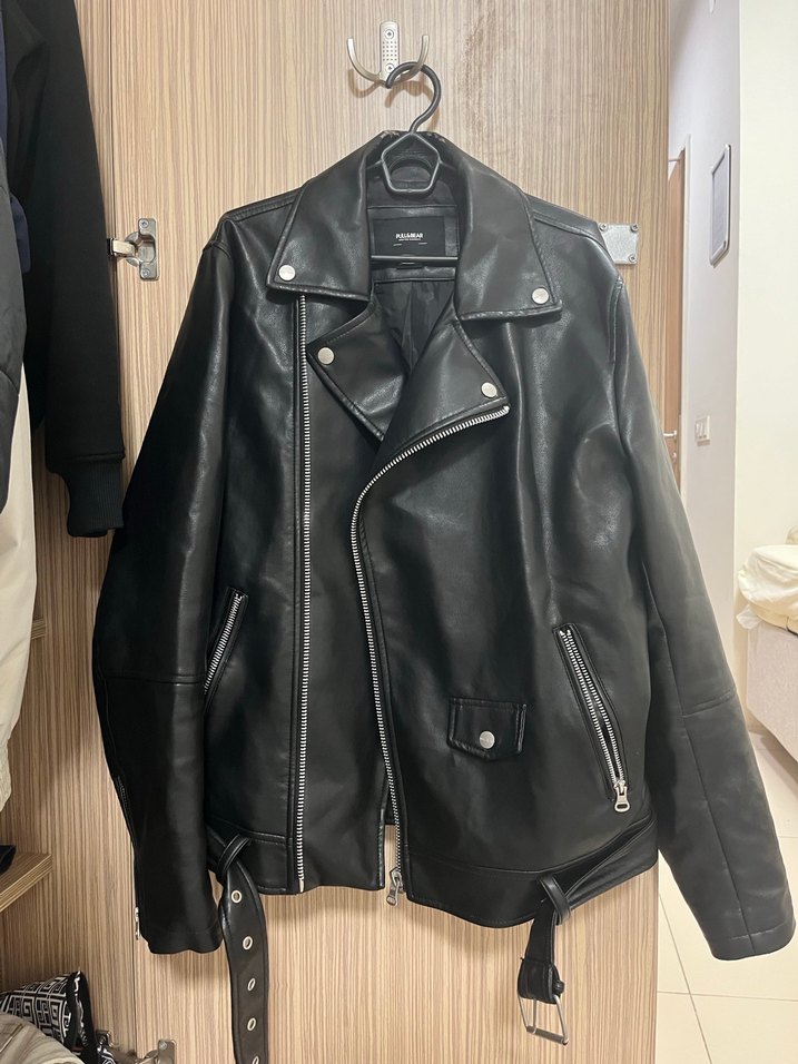 Siyah deri biker ceket, tokalı kayışlar ve kesik yaka ile. Günlük kullanım için uygun, regular fit ve desensiz tasarım, rock punk havasında. yaka kısmında daha yenı defosu oldu cok kullanıslı kullanırken bellı olmuyor bıle nerdeyse artık gıymedıgım ıcın satıyorum unısex te giyilebilir ogrencıyım pazarlık yapılır