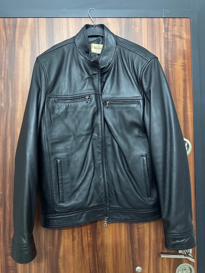 Siyah deri biker ceket, bisiklet yaka ve fermuarlı ceplerle, günlük rahat kullanım için uzun kollu ve regular fit olarak tasarlanmıştır.