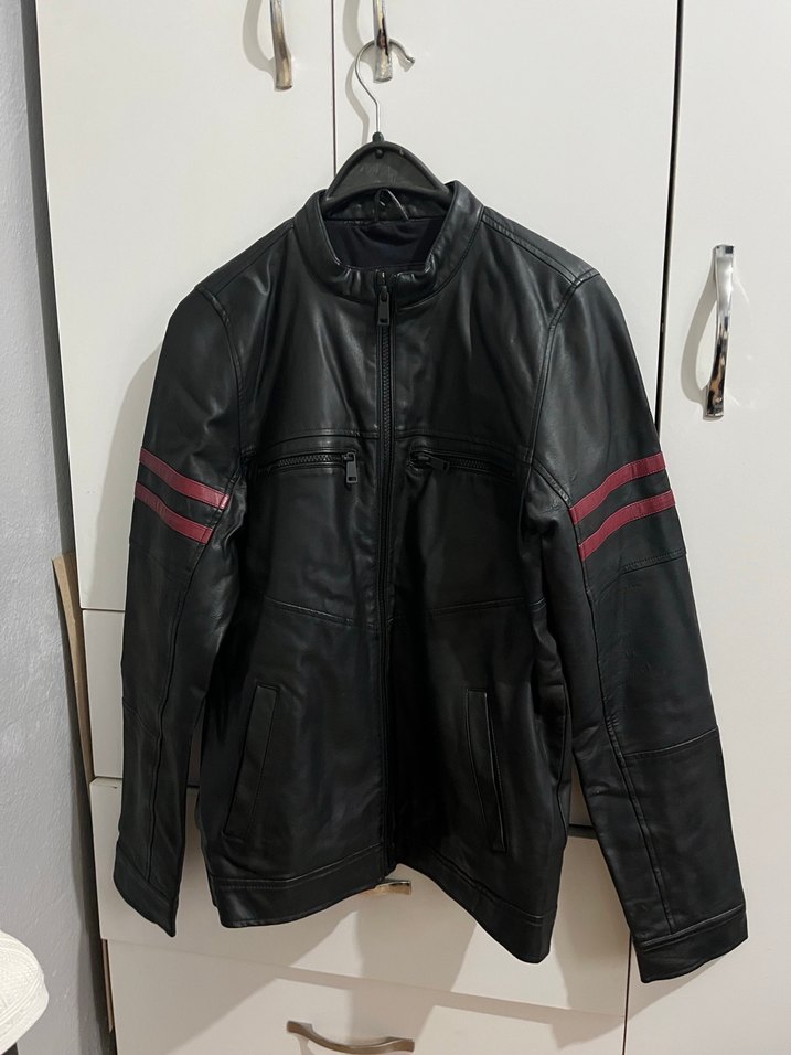 siyah deri ceket bi sıkıntısı yok sadece arka boyun kısmında ufak soyulmalar vardır resimde belirttigim gibi