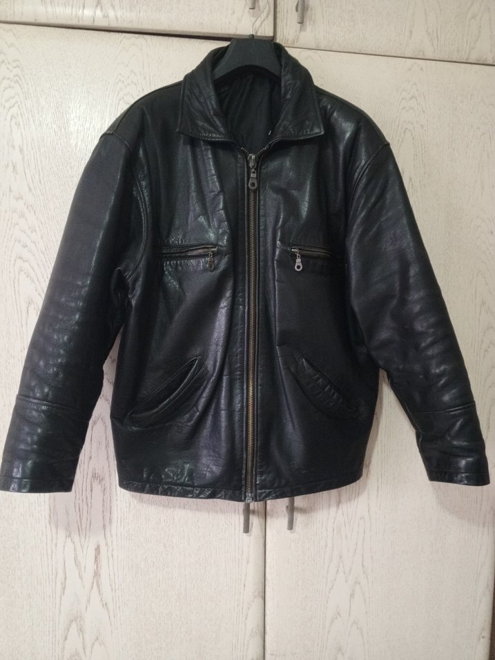 Siyah deri biker ceket, çıtçıtlı yaka, fermuarlı ön ve çoklu ceplerle. Salaş kesim ve uzun kolludur, günlük sokak tarzına uygundur.