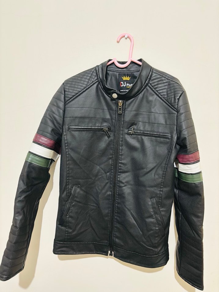 Erkek siyah deri biker ceket, çıtçıtlı yaka, fermuarlı ön ve uzun kolludur. Normal midi boy, regular fit ve günlük kullanıma uygundur. Kollarında renkli şerit detayları bulunur.