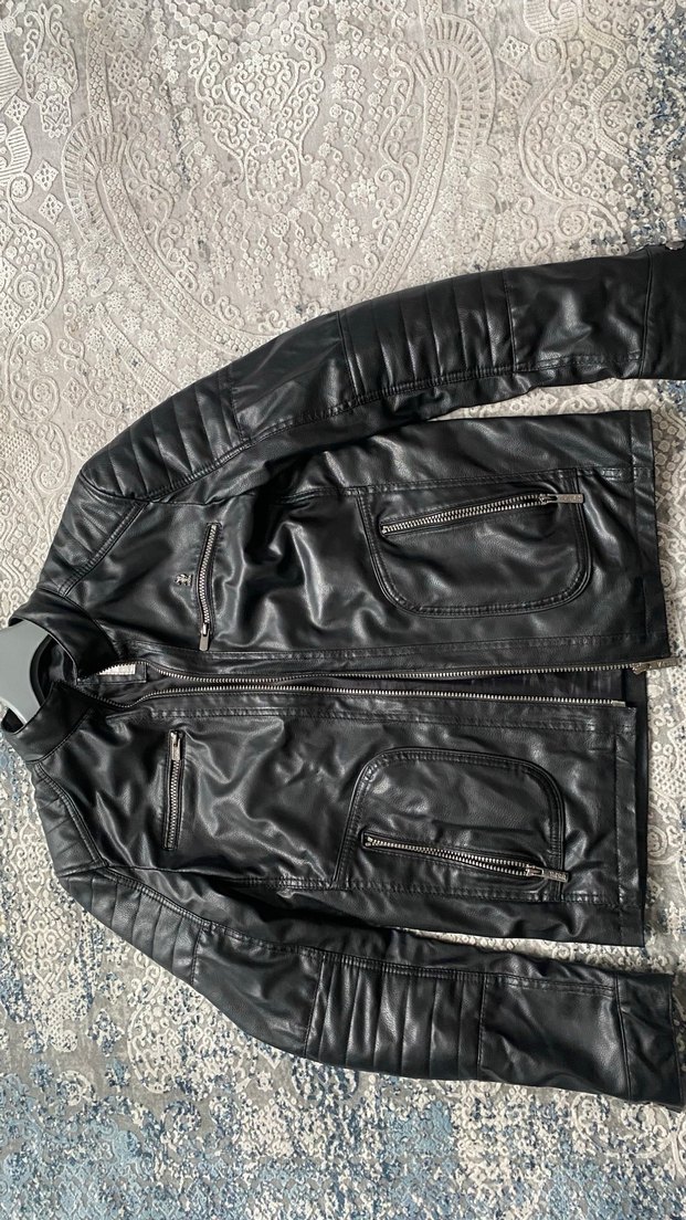 Fermuarlı cepleri ve kesik yaka detaylarıyla, dar kesim siyah deri biker ceket, günlük sokak stiline uygun strapy kollara sahiptir. Az kullanıldı sorunu yok.