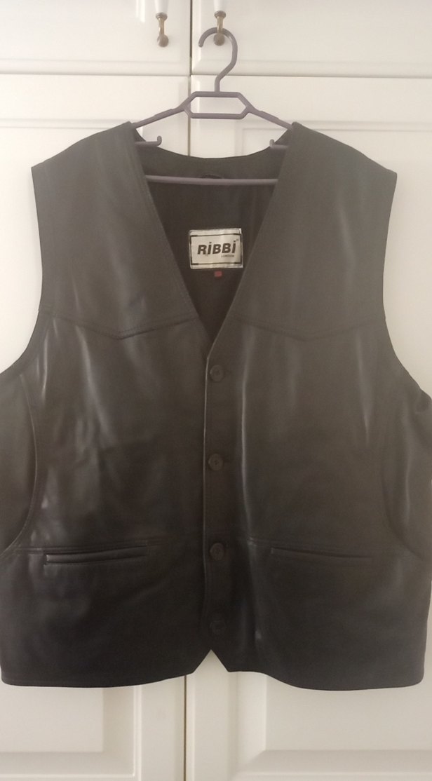 Siyah parlak deri, düğmeli, V yaka, normal ve midi boyda, düğmeli fit erkek biker yelek. Marka: RiBBi.