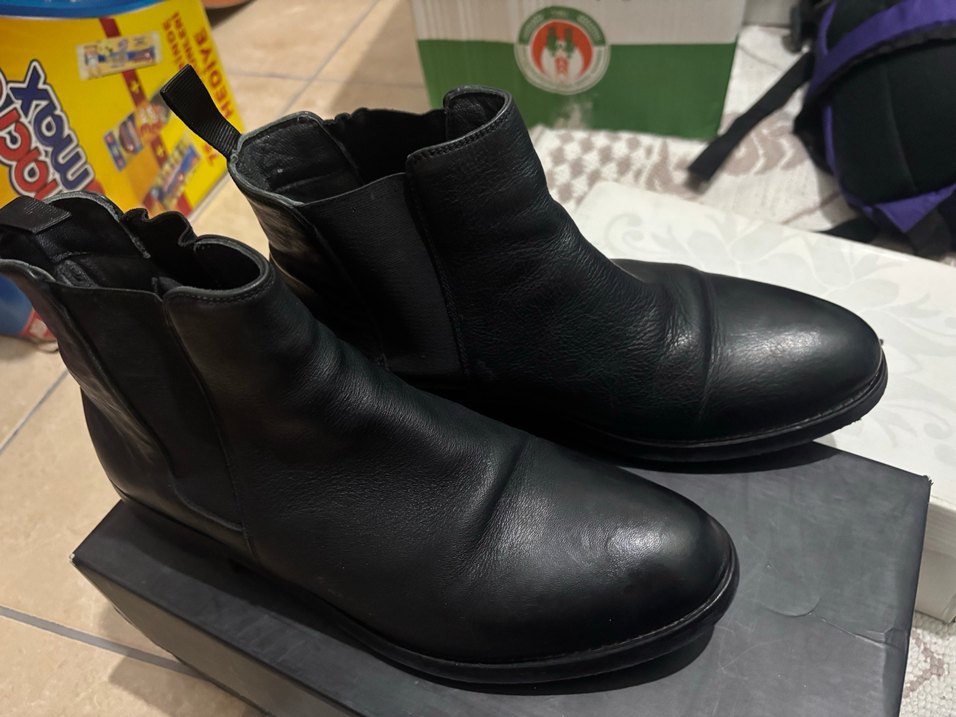 Siyah deri kadın botları, dolgu topuklu ve tokalı detaylıdır. Minimalist ve gotik tarzda, günlük kullanıma uygundur.