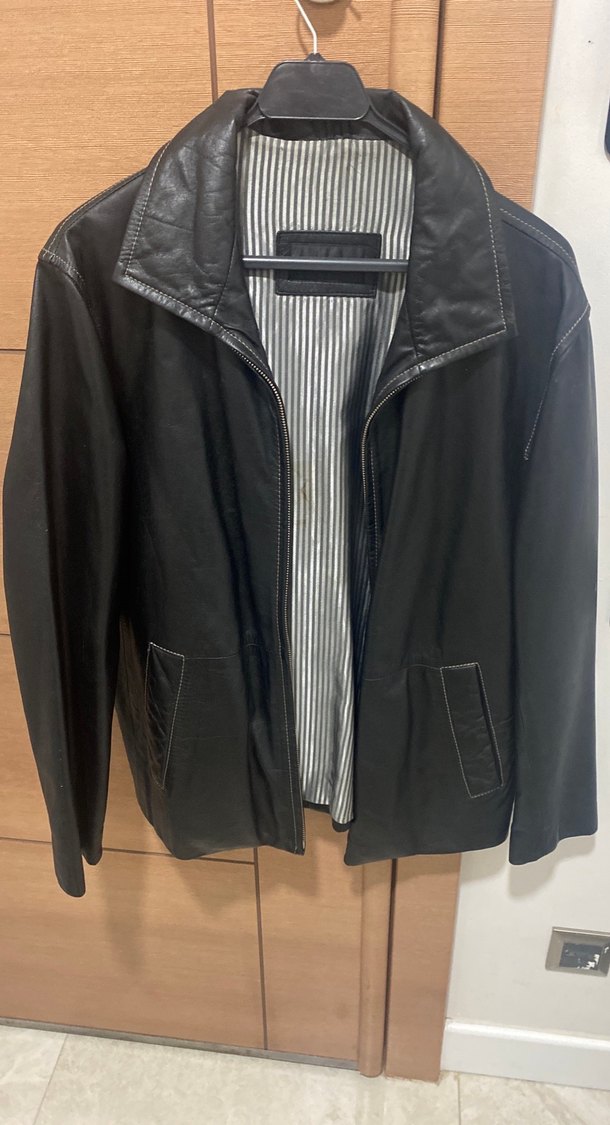 Erkek siyah deri ceket, çıtçıtlı yaka ve fermuarlı ön kısmı ile. Normal kesim, uzun kollu, ofis ve günlük kullanım için uygundur. Çizgili iç astar bulunur.