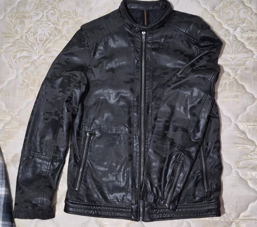 sayılı giyildi tertemeiz Erkek siyah deri biker ceket, kamuflaj desenli ve fermuarlı ceplidir. Çentikli yaka, uzun kollu ve günlük kullanıma uygun normal kesimdir.