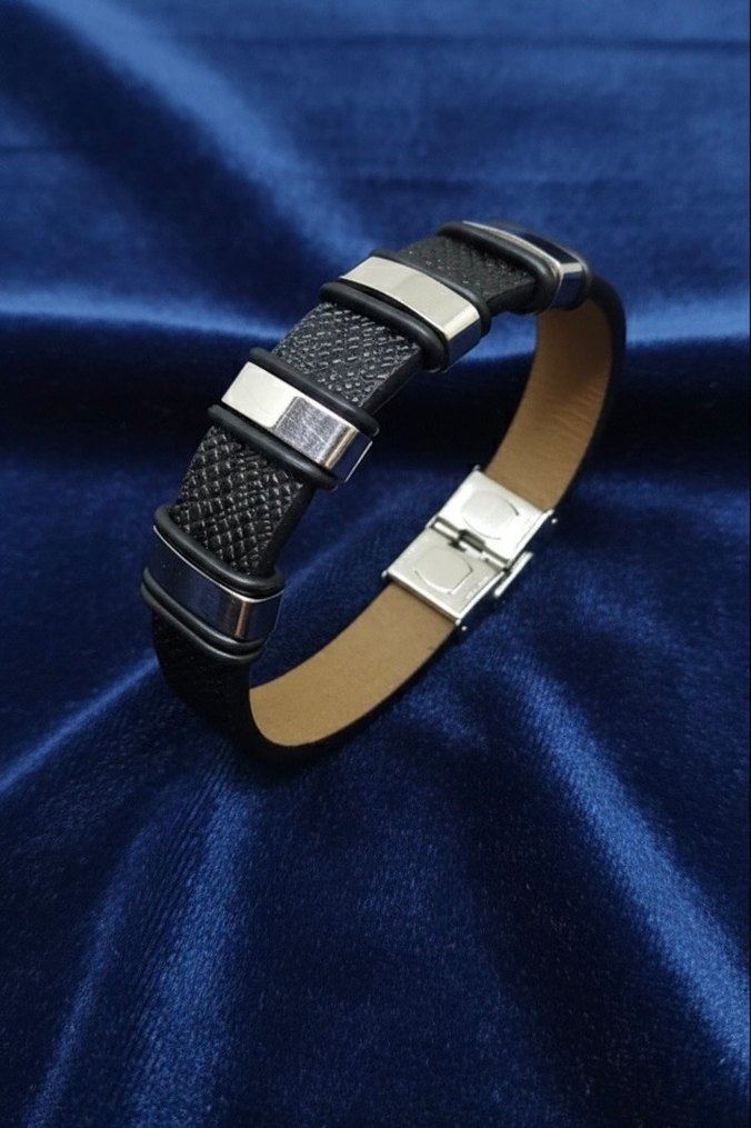 Dokulu deri ve gümüş metal detaylara sahip siyah biker tarzı erkek bileklik, trend günlük stil için uygun.