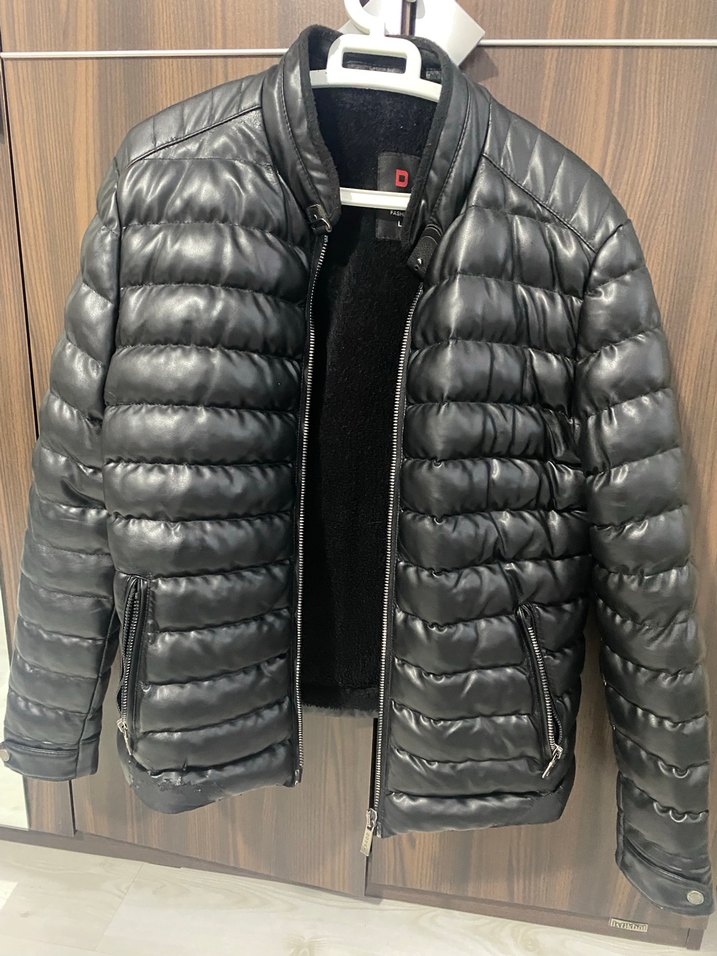 Bu siyah deri ceket, fermuarlı cepler ve kesik yaka ile sokak stiline uygun, fitted kesim ve midi boyda uzun kolludur. Ufak tefek soyulmalar var kullanıma engel değildir.