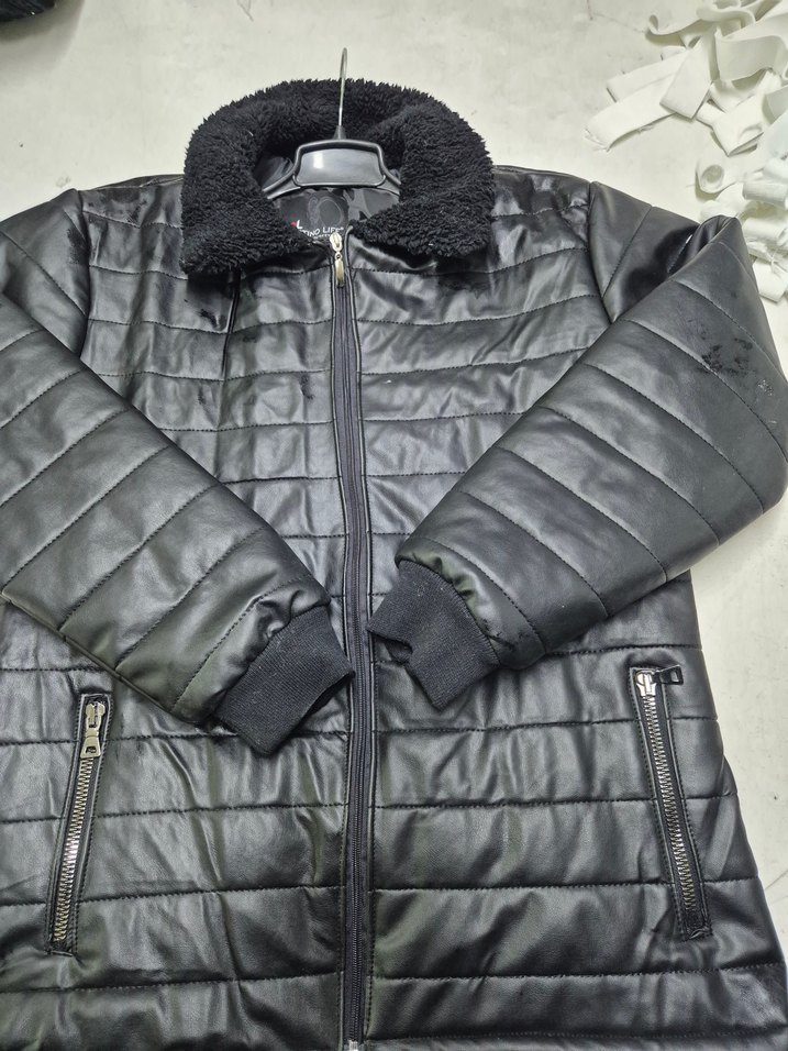Siyah deri, fermuarlı cepler ve yakalı, uzun kollu, dar kesim erkek ceket. Günlük sokak stili için uygundur.