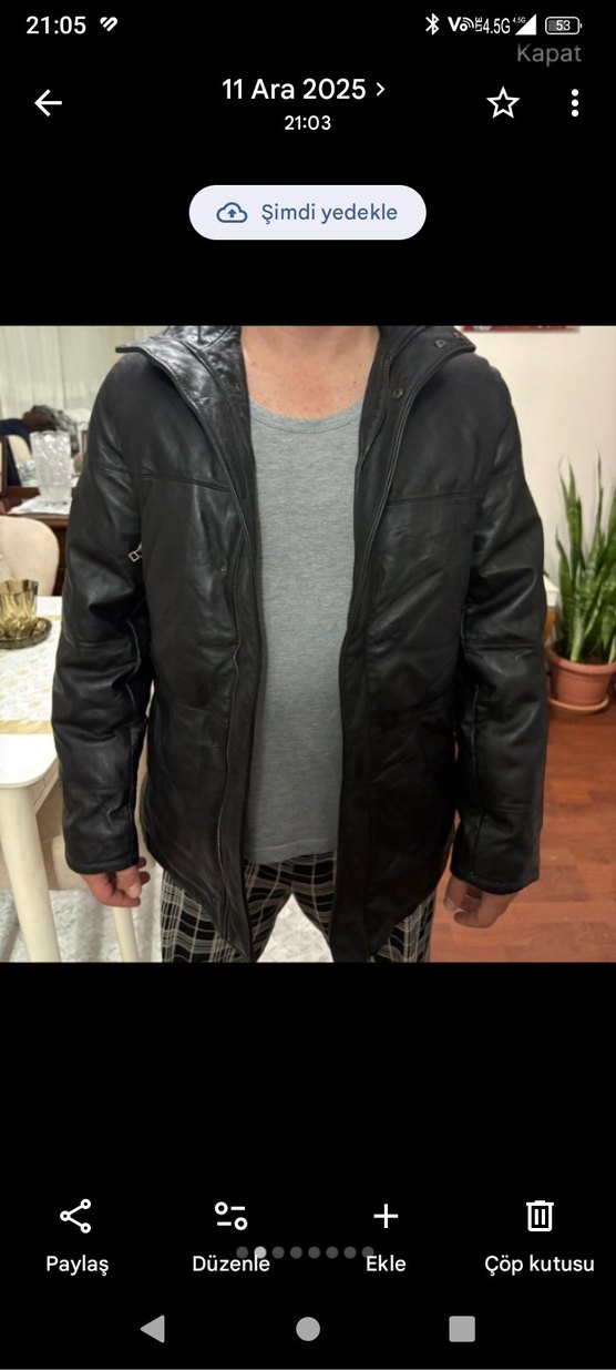 Fermuarlı cepler ve yakası bulunan, uzun kollu, siyah deri, dar kesim erkek ceket. Günlük kullanıma uygun sokak tarzı.