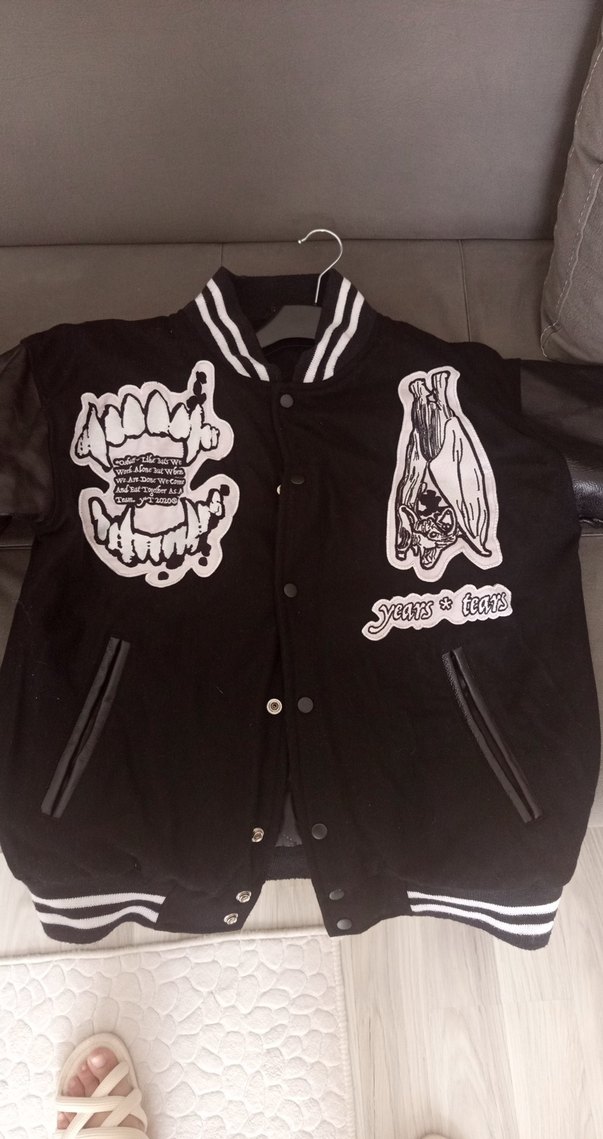 Erkekler için siyah deri ceket, baskılı desenler ve düğmeli kapanışa sahip. Notlu yaka, bol kesim ve rock punk havası taşıyor. hiç kullanılmadı.kollari deri çıtçıt karı sağlam siyah renk .