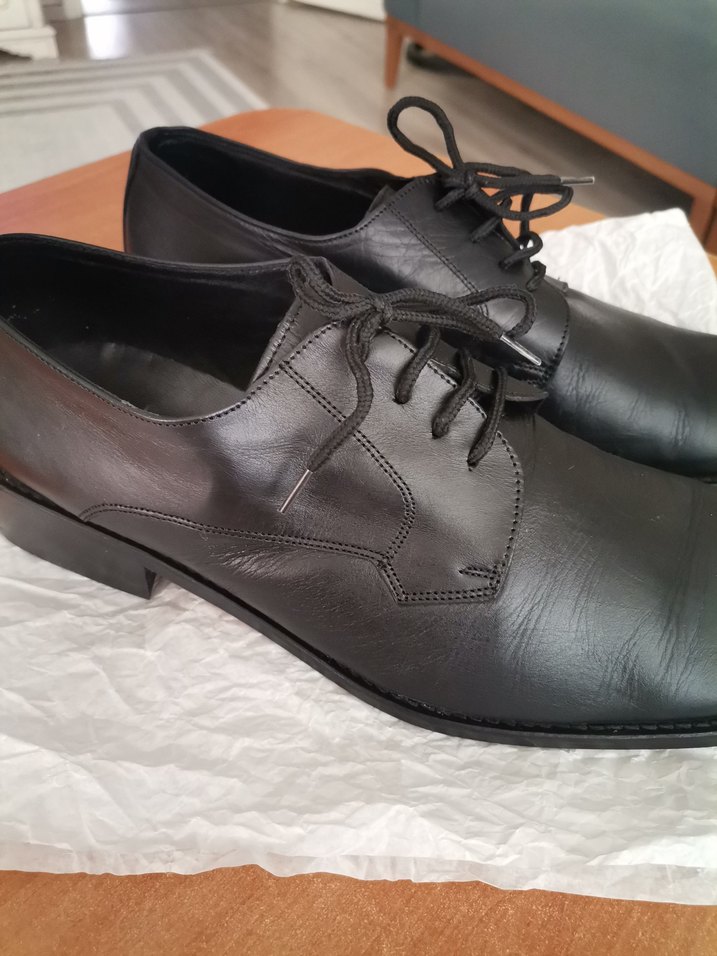 Siyah deri erkek klasik bağcıklı ayakkabılar, düz ve desensiz tasarımıyla ofis için uygundur. Klasik zarafet için ideal. az nadir kullanıldı . herhangi bir sorunu yoktur.