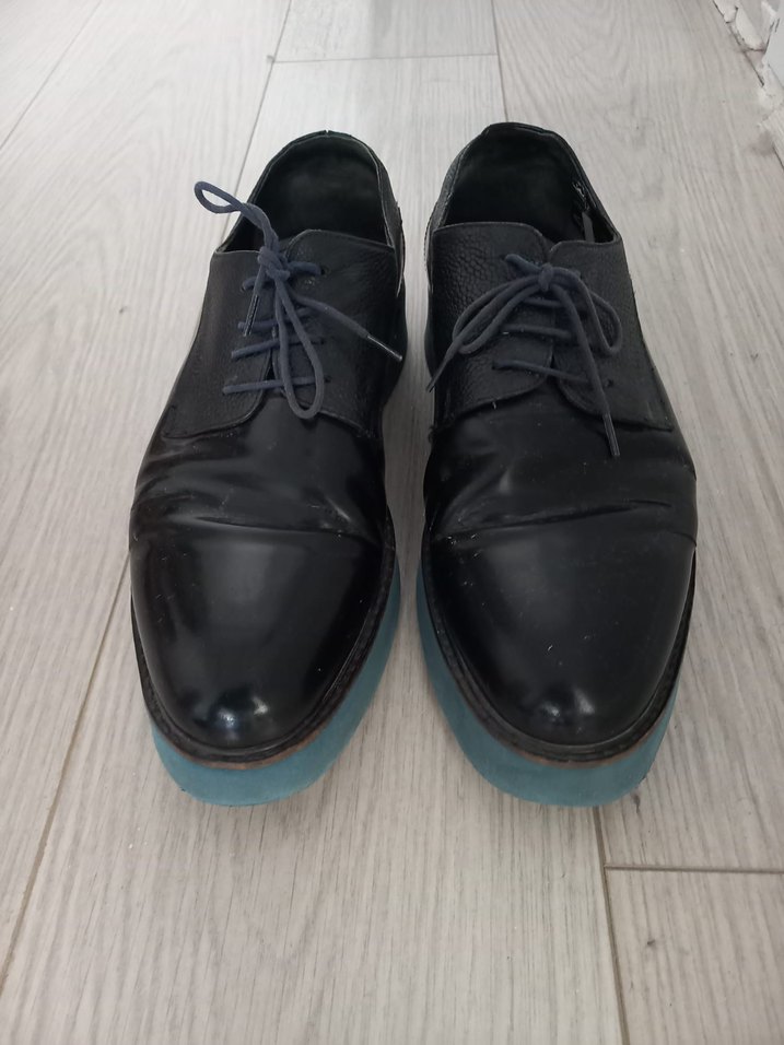 Siyah deri erkek klasik ayakkabılar, düz ve desensiz yüzeye sahip. Ofis kullanımı için uygun, goth tarzıyla zahmetsiz şıklığı birleştiriyor. Koyu tonlarda, zarif görünüm sağlar. tabanı mavi, makul üründür.