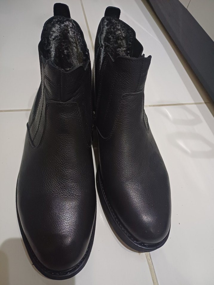 Siyah deri erkek botlar, kürk detaylıdır. Günlük kullanıma uygun, minimalist ve rahat bir sokak stili sunar.