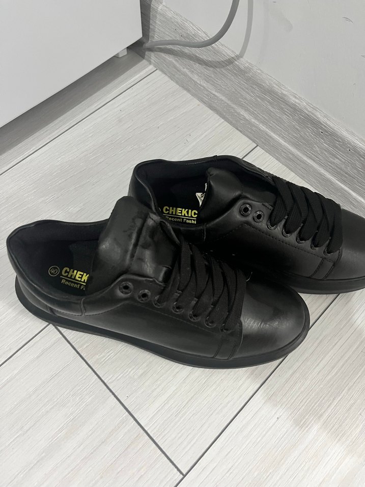 Siyah erkek sneakers, günlük kullanım için rahat ve şık. Düz, deseniz dış yüzeyi ve CHEKIC marka iç detaylarıyla dikkat çekiyor.